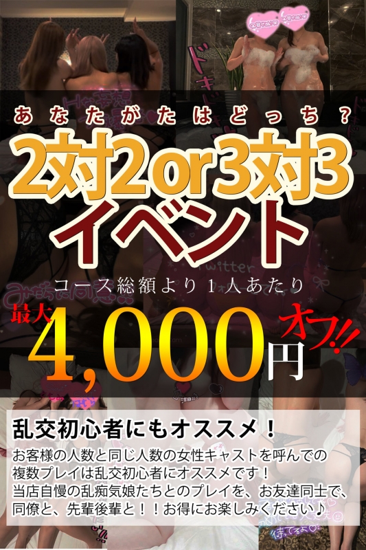 皆様お待たせいたしました!『2対2 or 3対3 イベント』を新設致しました♪お客様と女の子が同じ人数でのお遊びをご希望のお客様の為のスペシャルイベントになります!長く遊べば遊ぶほどお得になるイベントです♪同人数ならではの合コン気分が楽しんじゃえます。 どう楽しむかはお客様次第!!!是非お問い合わせお待ちしてます。