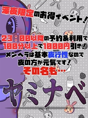 ・23:00以降... ・予約&利用で適応可能! ・100分以上で1000円引き! ・メンヘラは夜行性なので、 ・夜の方が元気なのデス! ・病み(ヤミ)×夜なべ(ナベ) その名も… 【ヤミナベ】 遅い時間の利用でお得! 飲み会明けに利用してもヨキ! 終電逃した方も適応可能! メンヘラにとっては一番元気な時間デス☆ 23:00以降の、 予約&利用で適応デス☆ 病み(ヤミ) + 夜なべ(ナベ) で... 「ヤミナベ」 指名もできるけど、 リアル闇鍋(フリー)でも 楽しめると思うゼ☆ 受付時に 「ヤミナベ」 とお伝え下され☆