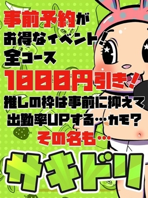 ・事前予約イベント! ・全コース1000円割引! ・推しの出勤率は… ・事前予約でアゲるッッッ!!! その名も… 【サキドリ】 このイベントの良い所は 割引だけではございません!!! メンヘラとは承認欲求の塊… 時間とお金をかけた分だけ、 傾く愛はヘビー級にッッッ!!! そんなメンヘラのとって事前予約は、 まさに出勤するための理由! アナタが出勤率を爆アゲしちゃう!? ついでに割引もしちゃう!?!? 一つの予約で2度美味しい。 承認欲求はアゲて、 金額はサゲるベシッッッ!!! 受付時に 「サキドリ」 とお伝え下され☆